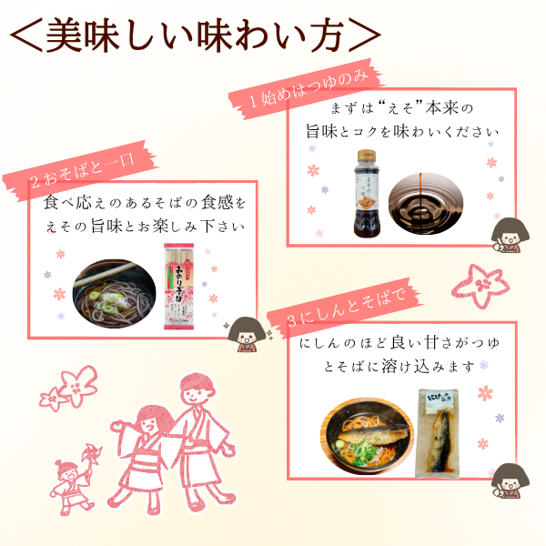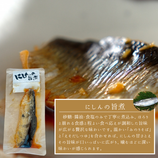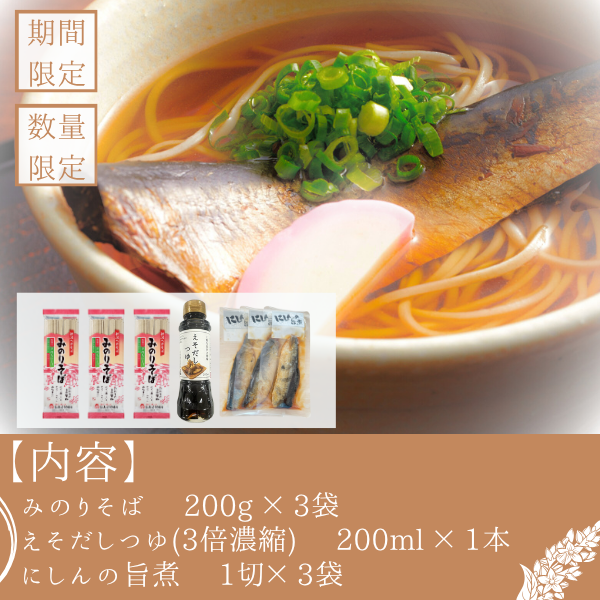 丹念に煮上げた柔らかなにしん、そして高級かまぼこの原料に使用され、旨味が凝縮された魚「えそ」を出汁に用いたつゆを数量限定の特別なセットにいたしました。ご家庭での団らんはもちろん、冬の贈答品としても格別の一品です。この季節ならではの「にしんそば」で、心まで温まる美味しさをお楽しみください。