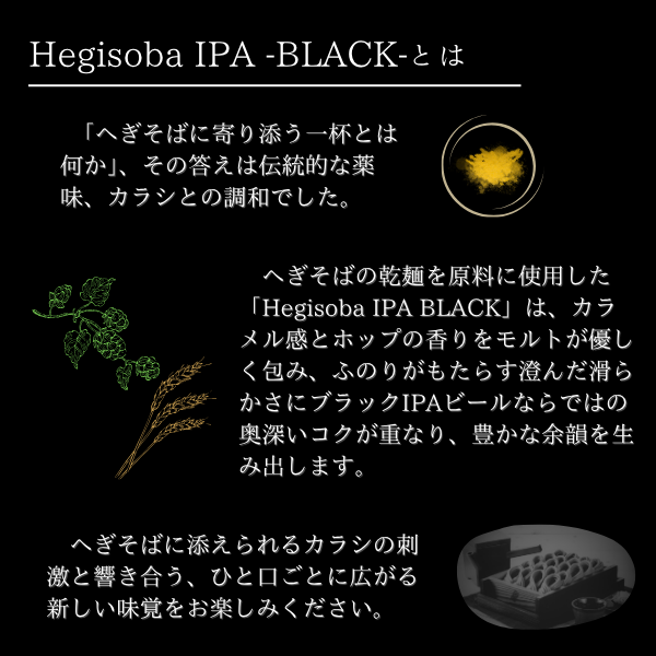 へぎそばの乾麺を原料に使用した「Hegisoba IPA BLACK」は、カラメル感とホップの香りをモルトが優しく包み、ふのりがもたらす澄んだ滑らかさにブラックIPAビールならではの奥深いコクが重なり、豊かな余韻を生み出します。