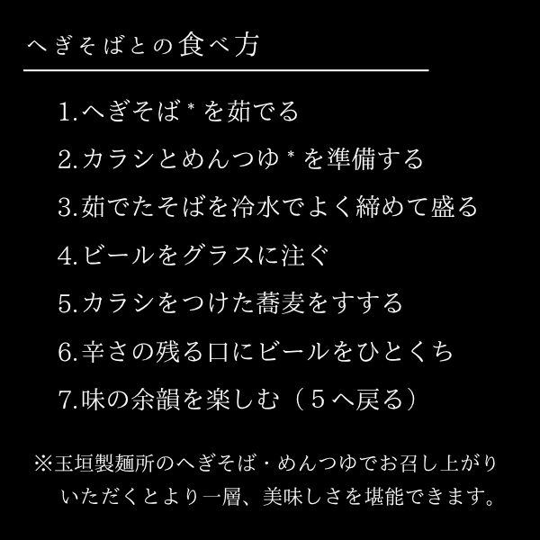 大麦麦芽(イギリス製造)、ホップ、へぎそば(そば粉・小麦粉含む)、ふのり